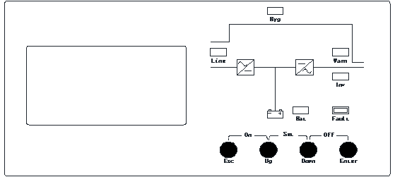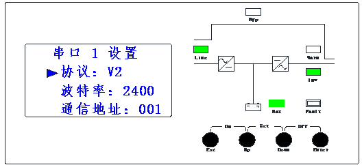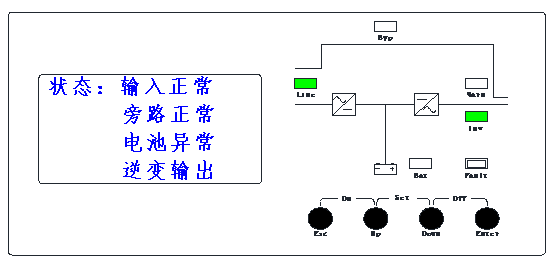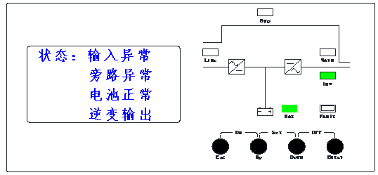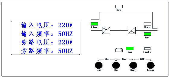 例如:“市電”亮,“逆變”滅,“電池” 1秒1閃,“負載”滅,蜂鳴器1秒1聲