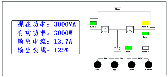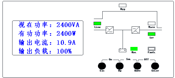 含義:處于市電輸出狀態,直流輸入過壓,負載正常,無過溫。