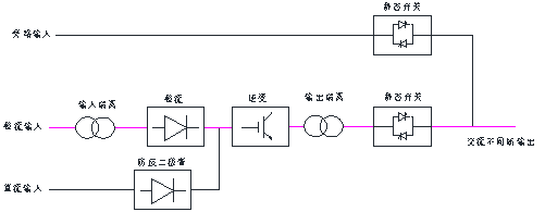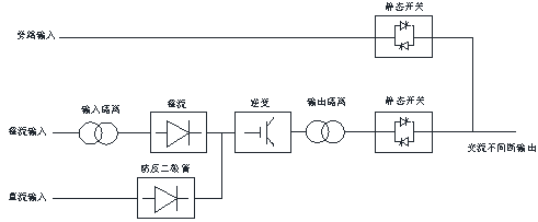 2.正常工作時,整流輸入經輸入隔離變壓器后送到整流器,轉 變成直流,再送到逆變器,由逆變器轉換成純凈的正弦波電源,經靜態開關轉換輸出,給負載供電。