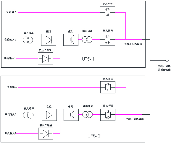 當UPS初始上電后旁路輸入經過靜態開關輸出。正常運轉時,整流輸入電源經輸入隔離變壓器后,由整流器整成直流電,經逆變器轉成純凈的正弦波電源,再經由靜態開關斷開旁路輸出,由純逆變電源輸出送至用戶設備使用。